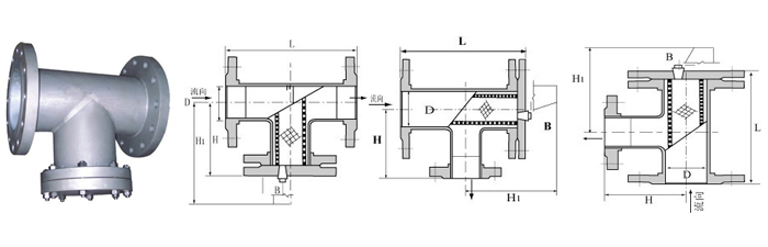 T型法蘭過濾器安裝于進(jìn)水管路中各配套閥門的前端,當(dāng)管道中的介質(zhì)首先進(jìn)入過濾器時(shí),介質(zhì)通過濾網(wǎng)進(jìn)入被連接的閥門中, 而雜質(zhì)則留于過濾桶內(nèi),使各類閥門不會(huì)由于機(jī)械雜物卡入密封圈而失靈。