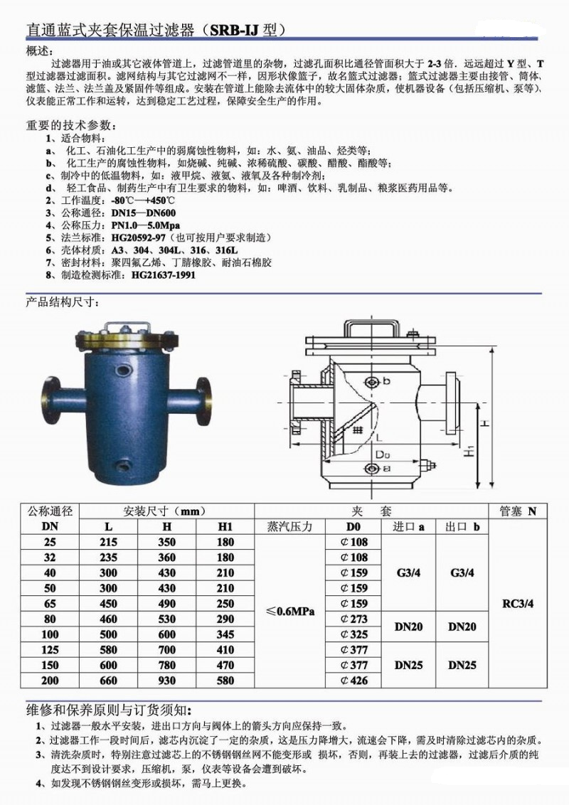 直通籃式夾套保溫過濾器在籃式過濾器的基礎上焊裝金屬夾套,用于注入通蒸汽或導熱油,以保持或提高流體的溫度,防止流體凝固,提高粘性液體的過濾速度,或滿足下一道工序對溫度的要求。籃式保溫過濾器采用整體式夾套結構設計,更能均勻地保溫、保冷,夾套采用碳素鋼管焊接比鑄造的更加耐壓牢固。 夾套、閥體外側與夾套接管焊接,允許蒸汽或冷水的最高壓力為1MPa。