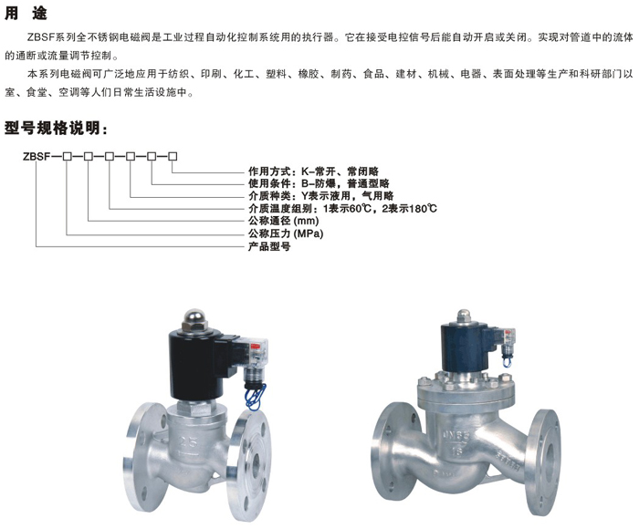 3、電磁閥按照功能分類:水用電磁閥、蒸汽電磁閥、制冷電磁閥、低溫電磁閥、燃?xì)怆姶砰y、消防電磁閥、氨用電磁閥、氣體電磁閥、液體電磁閥、微型電磁閥、脈沖電磁閥、液壓電磁閥 常開(kāi)電磁閥、油用電磁閥、直流電磁閥、高壓電磁閥、防爆電磁閥等