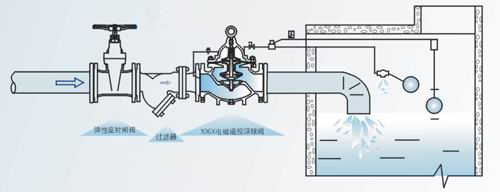 當水塔(池)的水面上升至設定高度時,浮球浮起關閉浮球閥,控制室內水壓升高,推動主閥關閉,供水停止。當水面下降時,浮球閥重新開啟,控制室水壓下降,主閥再次開啟繼續供水,保持液面的設定高度。