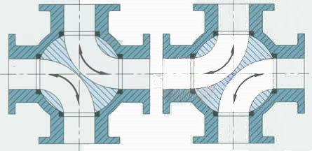 如圖所示“LL”型四通球閥只需操作扳手或執(zhí)行器將球體轉(zhuǎn)動(dòng)90度,可同時(shí)對(duì)兩種介質(zhì)的流向進(jìn)行切換,既方便又迅速,實(shí)現(xiàn)一閥多用的效果。